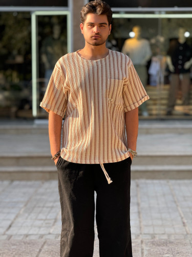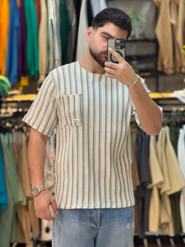 ناموجودتیشرت نیم زیپ پارچه میله ای رنگ کرم