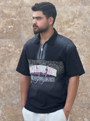 تیشرت یقه دار نیم زیپ نگین دوزی شده وارداتی