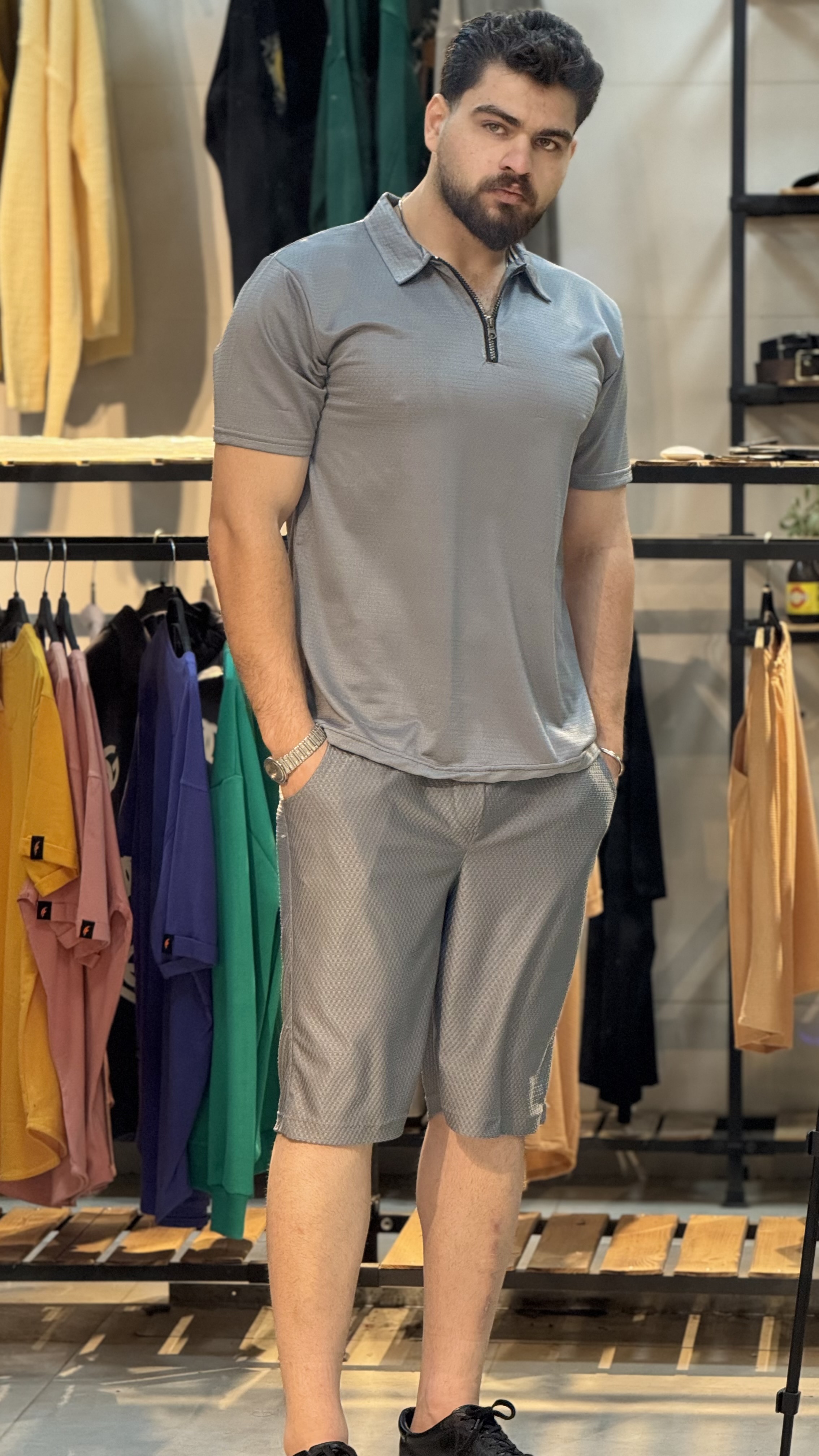 ست تیشرت نیم زیپ و شلوارک رنگ طوسی