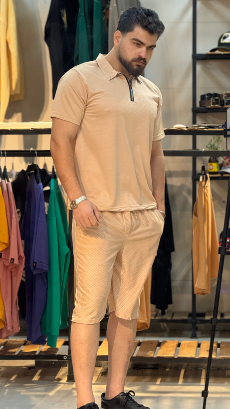 ست تیشرت نیمزیپ و شلوارک پارچهای بیسکوییتی، ترکیبی از راحتی و استایل مدرن.